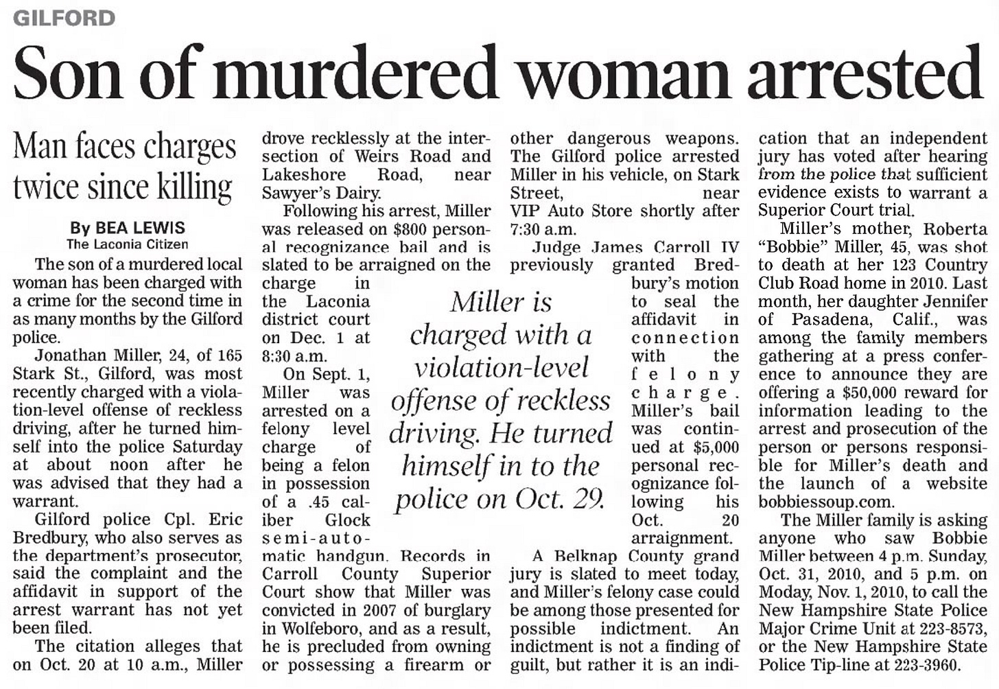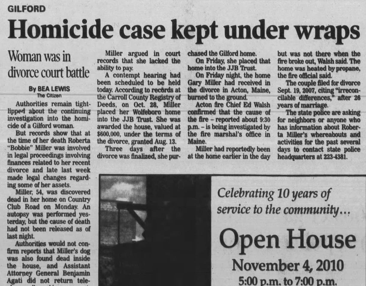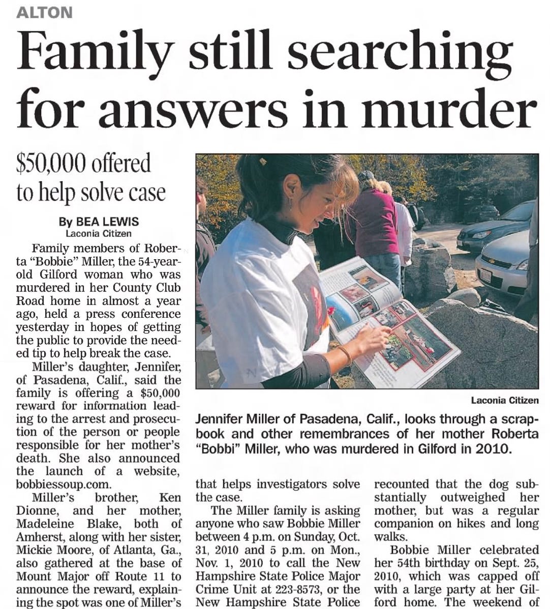 Tracy, Paula. “Family Wants Justice in 2010 Murder of Roberta Miller in Gilford.” In Depth NH, 27 February 2024, https://indepthnh.org/2024/02/27/family-wants-justice-in-2010-murder-of-roberta-miller-in-wolfeboro/