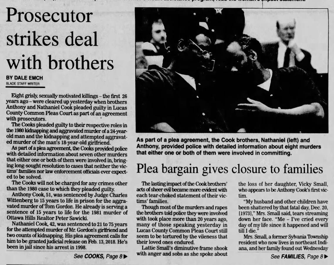 Dugger, Brian. “Toledo’s Most Prolific Serial Killer Faces Parole: Families of Victims, Prosecutor Speak Out.” wtol.com, https://www.wtol.com/article/news/investigations/11-investigates/most-prolific-serial-killer-in-toledo-history-makes-a-bid-for-freedom-cook-brothers-toledo-serial-killer-parole-hearing-2024/512-8887dce9-b91c-4bd6-8b60-ba64061f0902