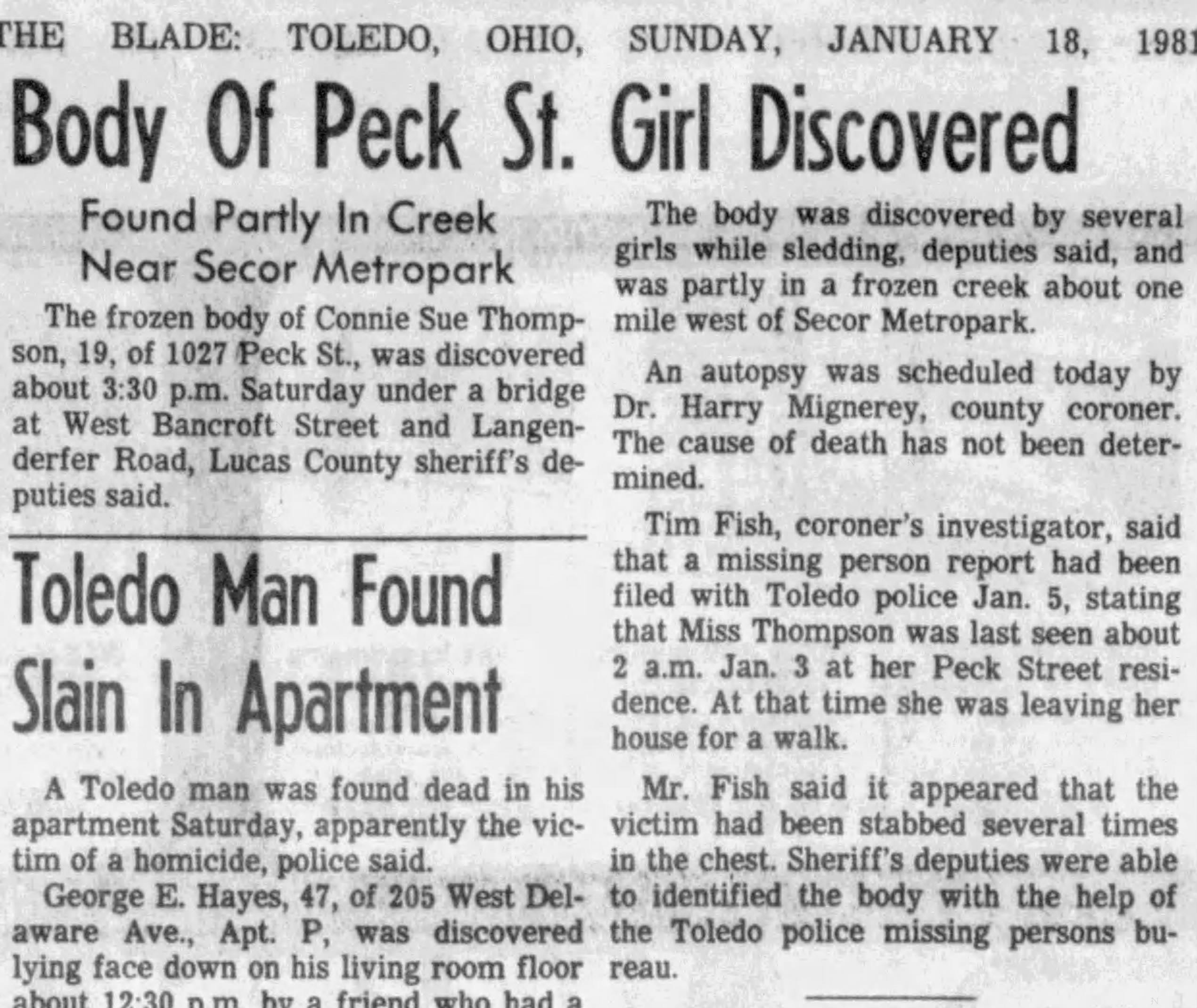 The thrill of their first attack kept the brothers satiated for a while, but when the new year rolled around, they were ready to strike again. On January 3rd, 1981, 19-year-old Connie Sue Thompson was hitchhiking near Toledo and accepted a ride from the Cook brothers.