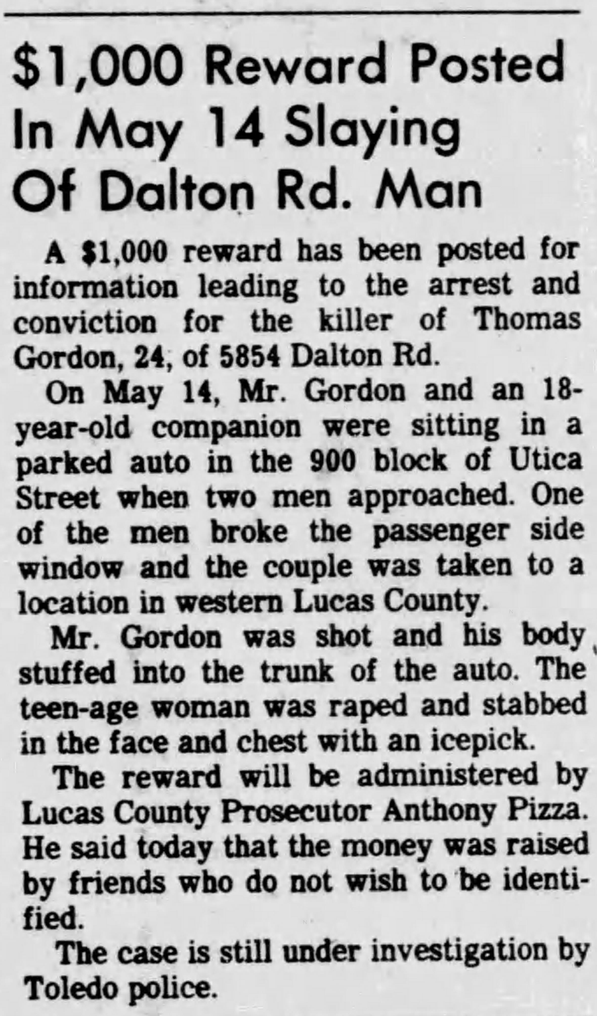 There, they shot and killed Thomas before taking turns raping his girlfriend. The brothers then stabbed her before fleeing. Remarkably, she survived the ordeal- one of the first victims of the Cook brothers, and one of the few survivors. Gordon’s body was found in the trunk of a car in Western Lucas County.