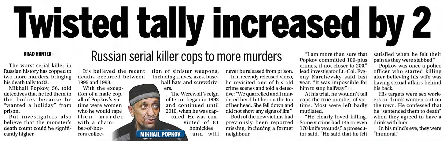 Roth, Andrew. “Russian serial killer convicted of 56 more murders.” The Guardian, 10 December 2018, https://www.theguardian.com/world/2018/dec/10/russias-worst-serial-killer-jailed-for-life-mikhail-popkov