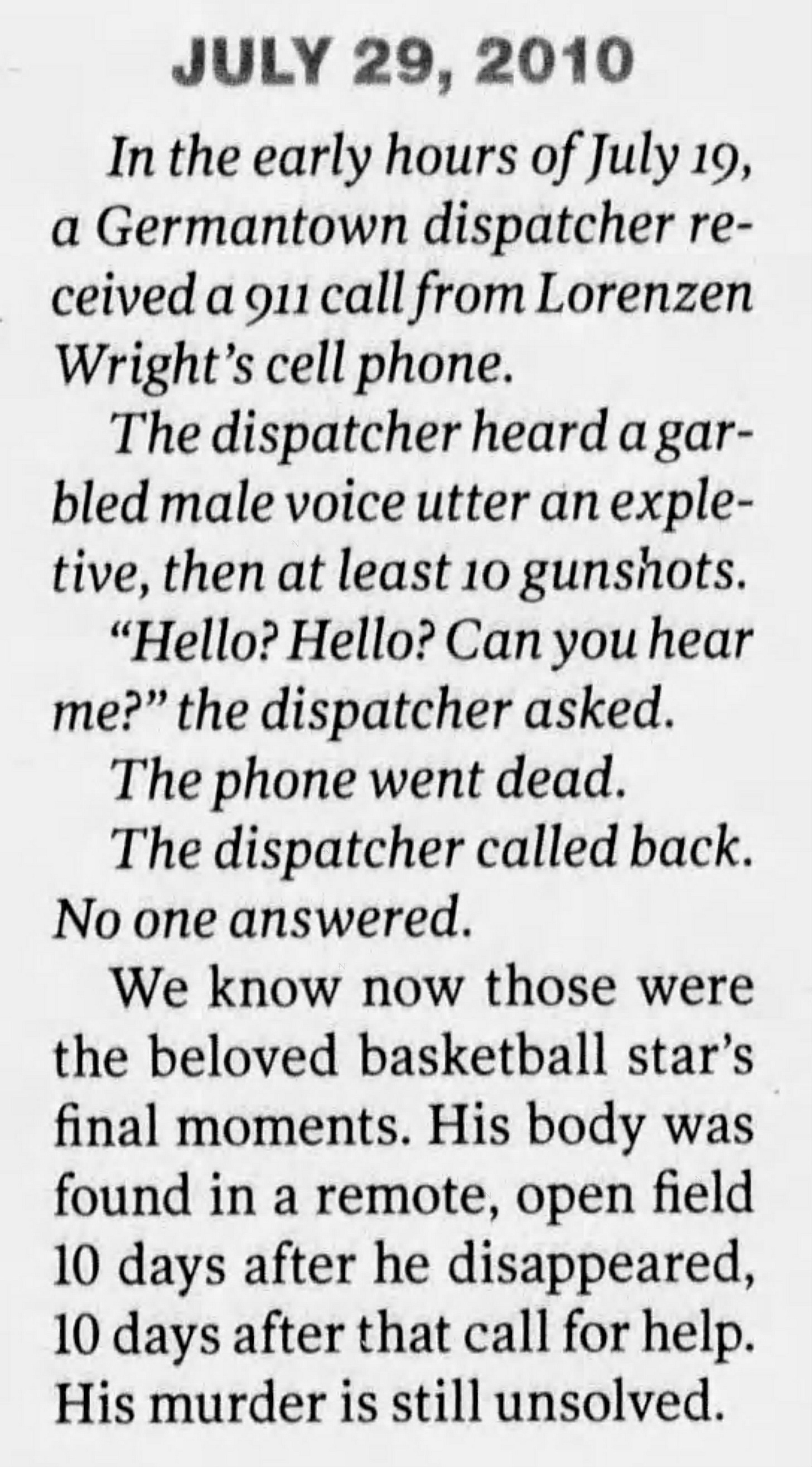 Sometime around 10:00 p.m., Lorenzen left the house. Sherra later told investigators that he said he was going to meet someone. A few hours later, at 12:18 a.m. on July 19, a 911 operator in Germantown, Tennessee received a strange call from Wright’s cell phone.