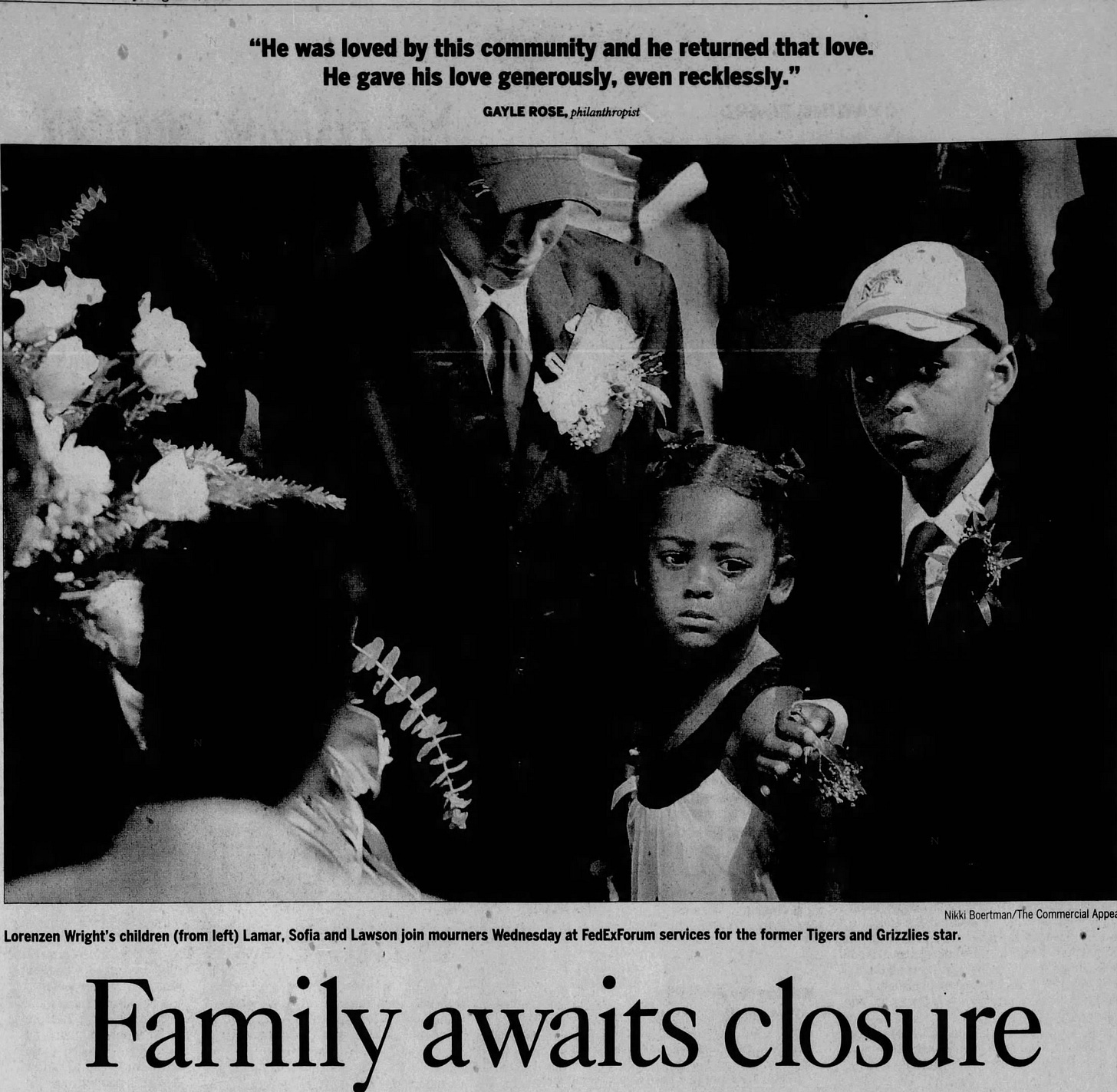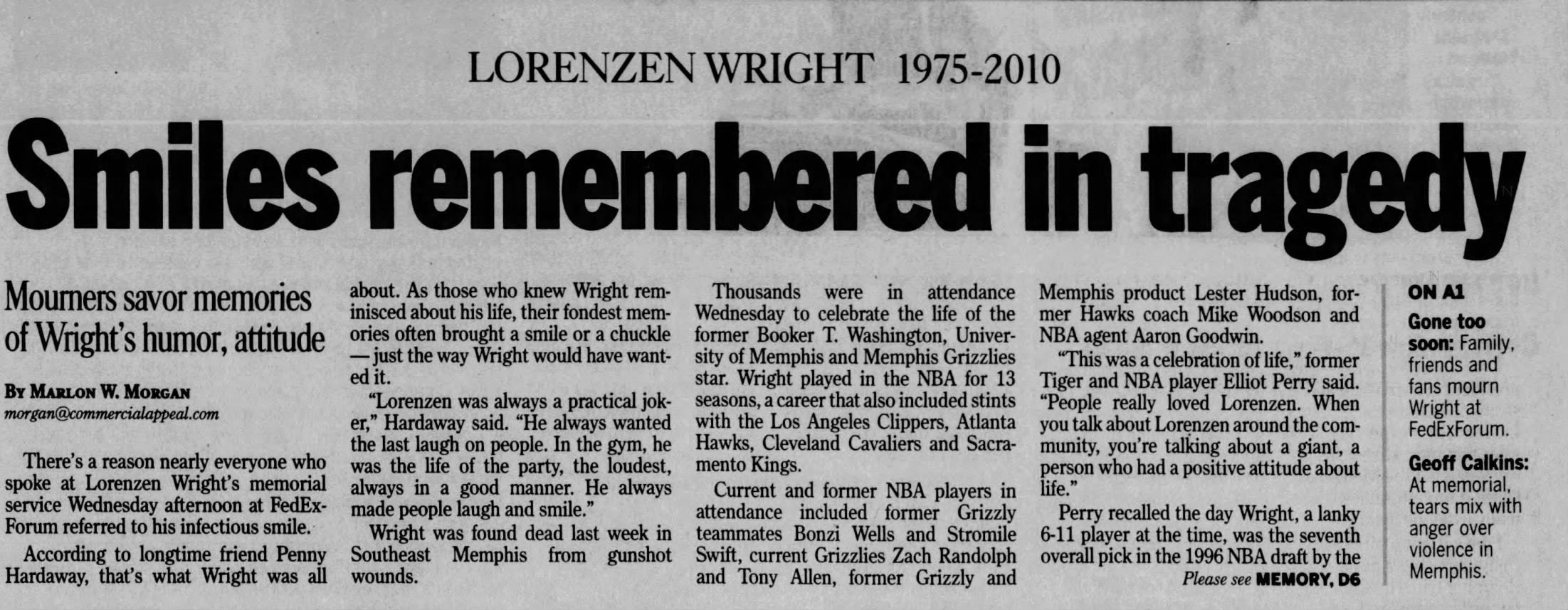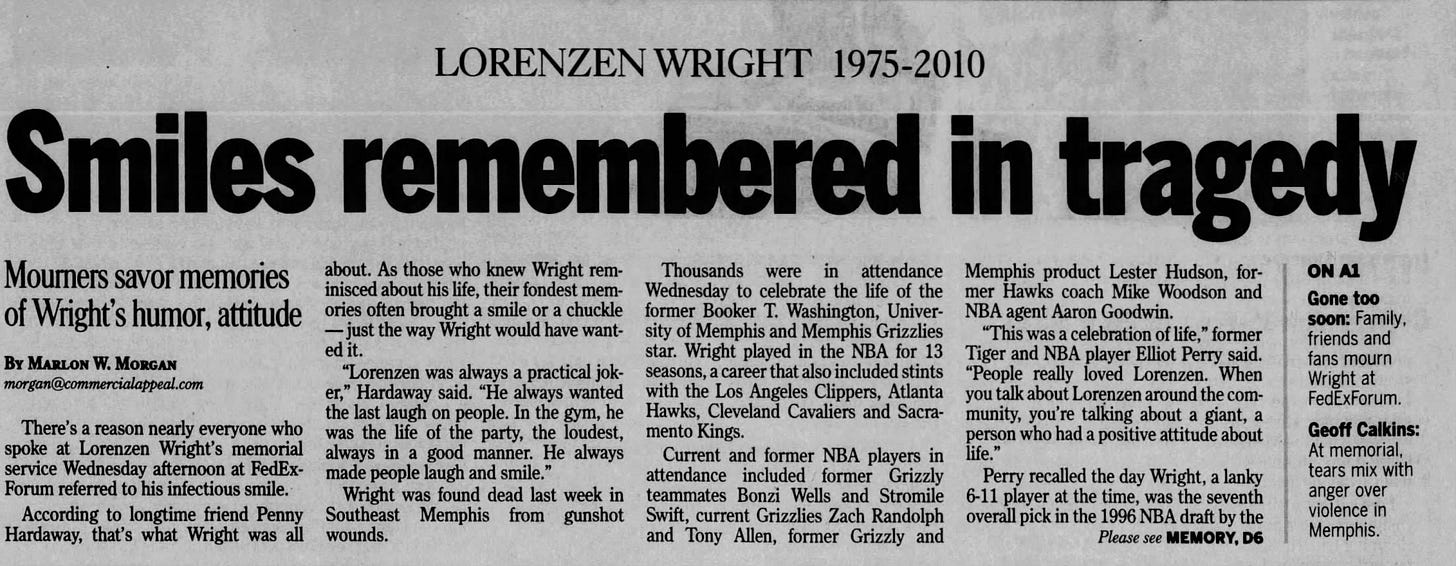 When news spread that Lorenzen Wright had been found dead on July 28, 2010, thousands of fans, friends, and fellow athletes mourned his death. Memorial services were held across the city, including a large public gathering at the FedExForum, the home arena of the Memphis Grizzlies.