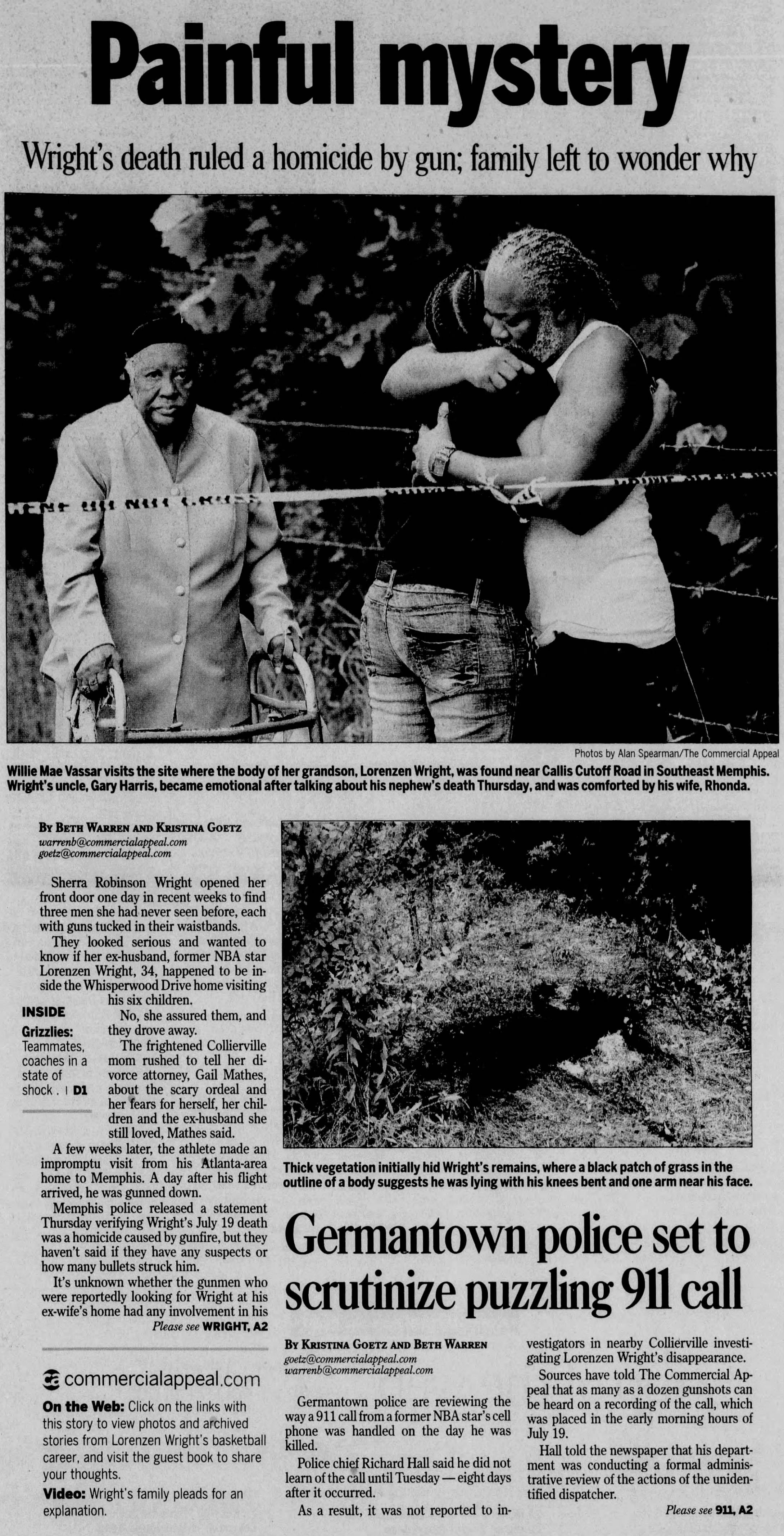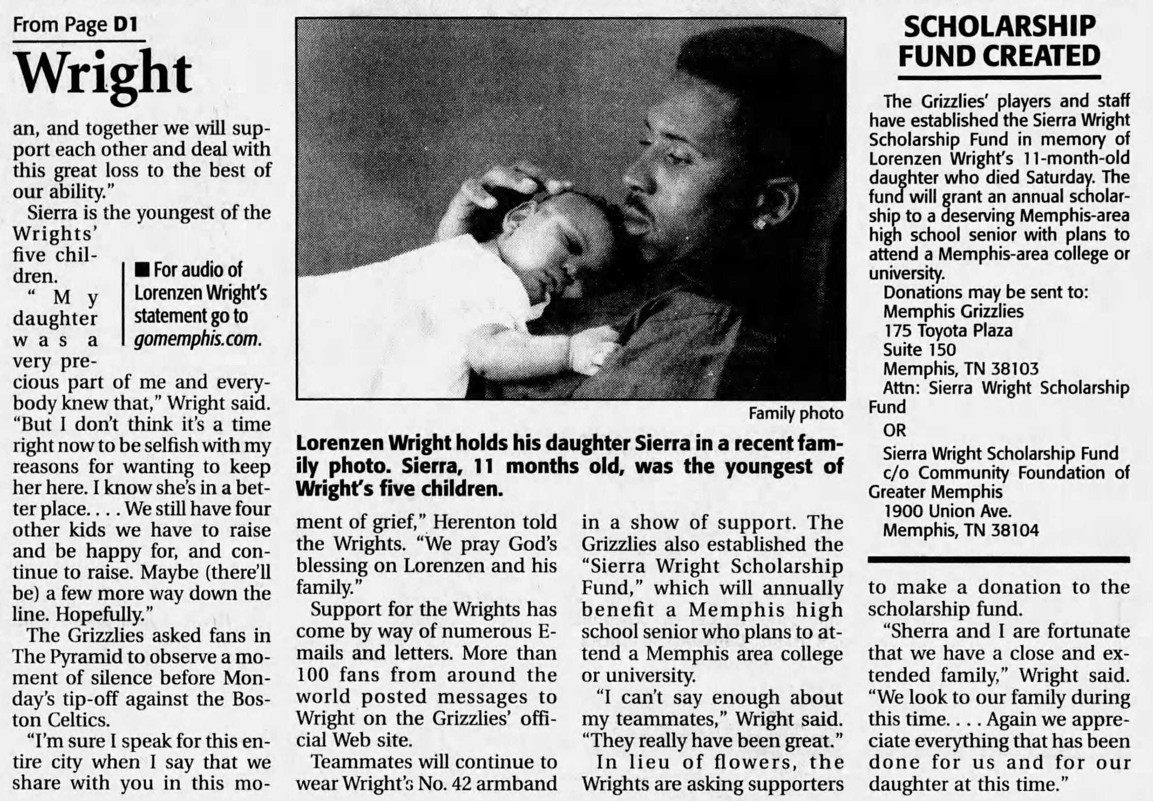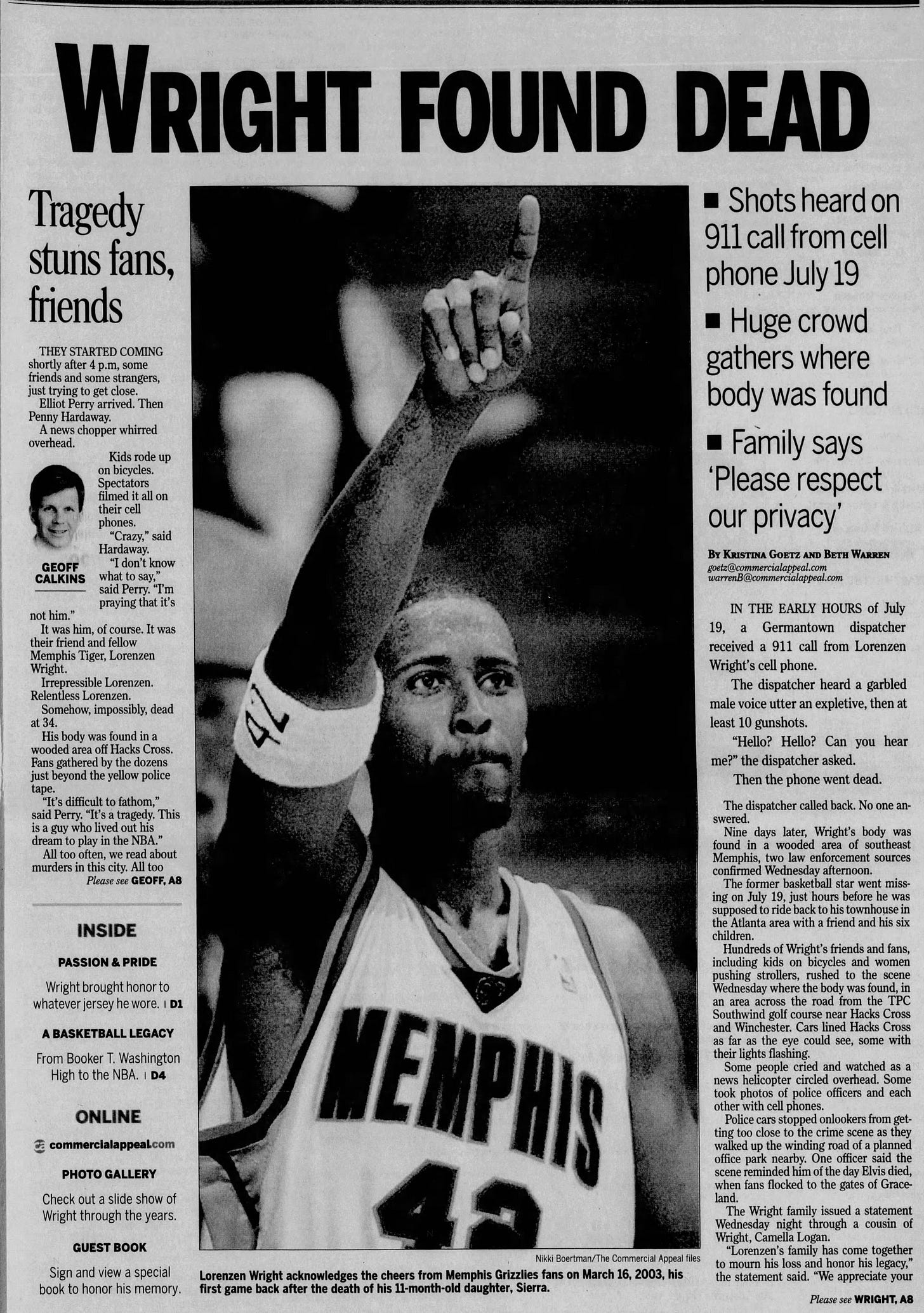 When news spread that Lorenzen Wright had been found dead on July 28, 2010, thousands of fans, friends, and fellow athletes mourned his death. Memorial services were held across the city, including a large public gathering at the FedExForum, the home arena of the Memphis Grizzlies.