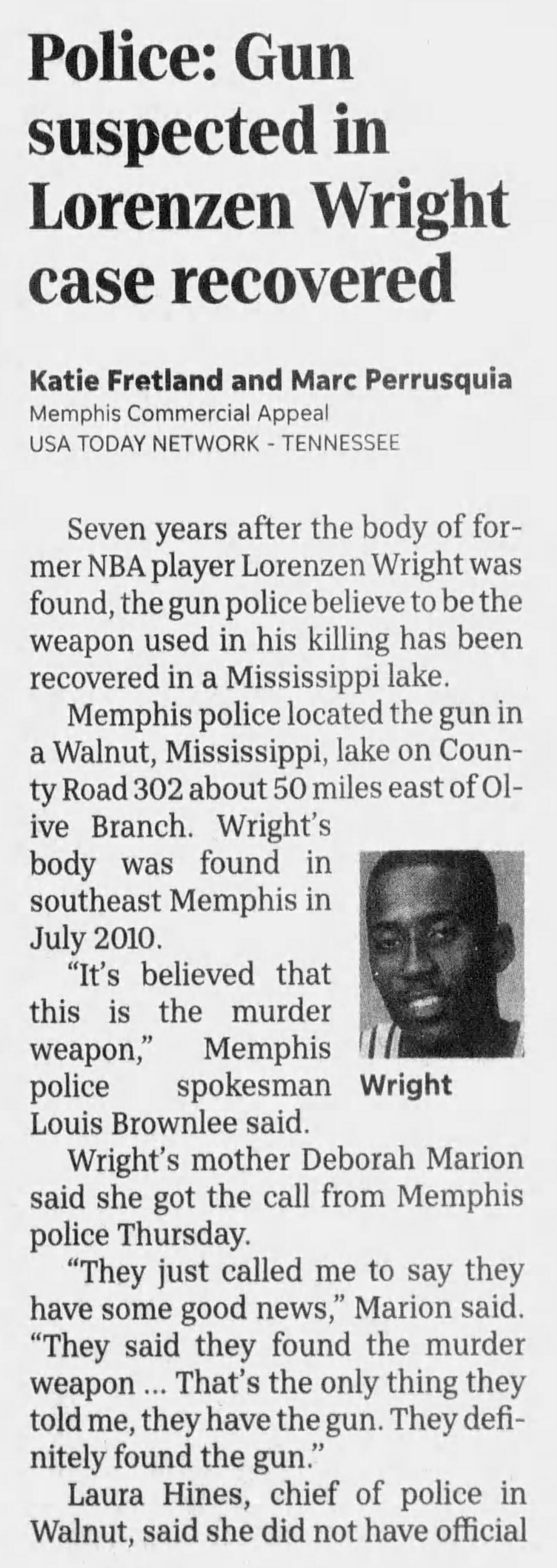 Nearly seven years after Lorenzen Wright’s death, investigators uncovered a crucial piece of evidence that completely changed the direction of the case. Earlier in the investigation, a witness had told authorities that the gun used in the killing had been thrown into a lake in Walnut, Mississippi, a small town about 75 miles east of Memphis. For years, that claim had led nowhere, but detectives decided to try once more.