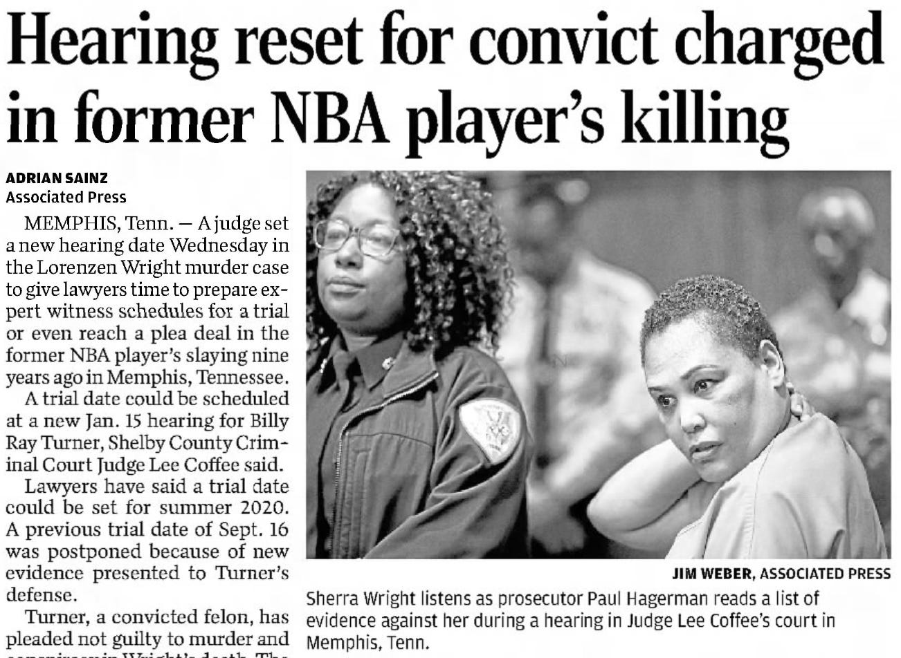 “Ex-Wife Pleads Guilty in Slaying of NBA Star Lorenzen Wright.” CBS News, 25 July 2019, https://www.cbsnews.com/news/lorenzen-wright-death-ex-wife-sherra-wright-pleads-guilty-in-killing-of-nba-star-today-2019-07-25/