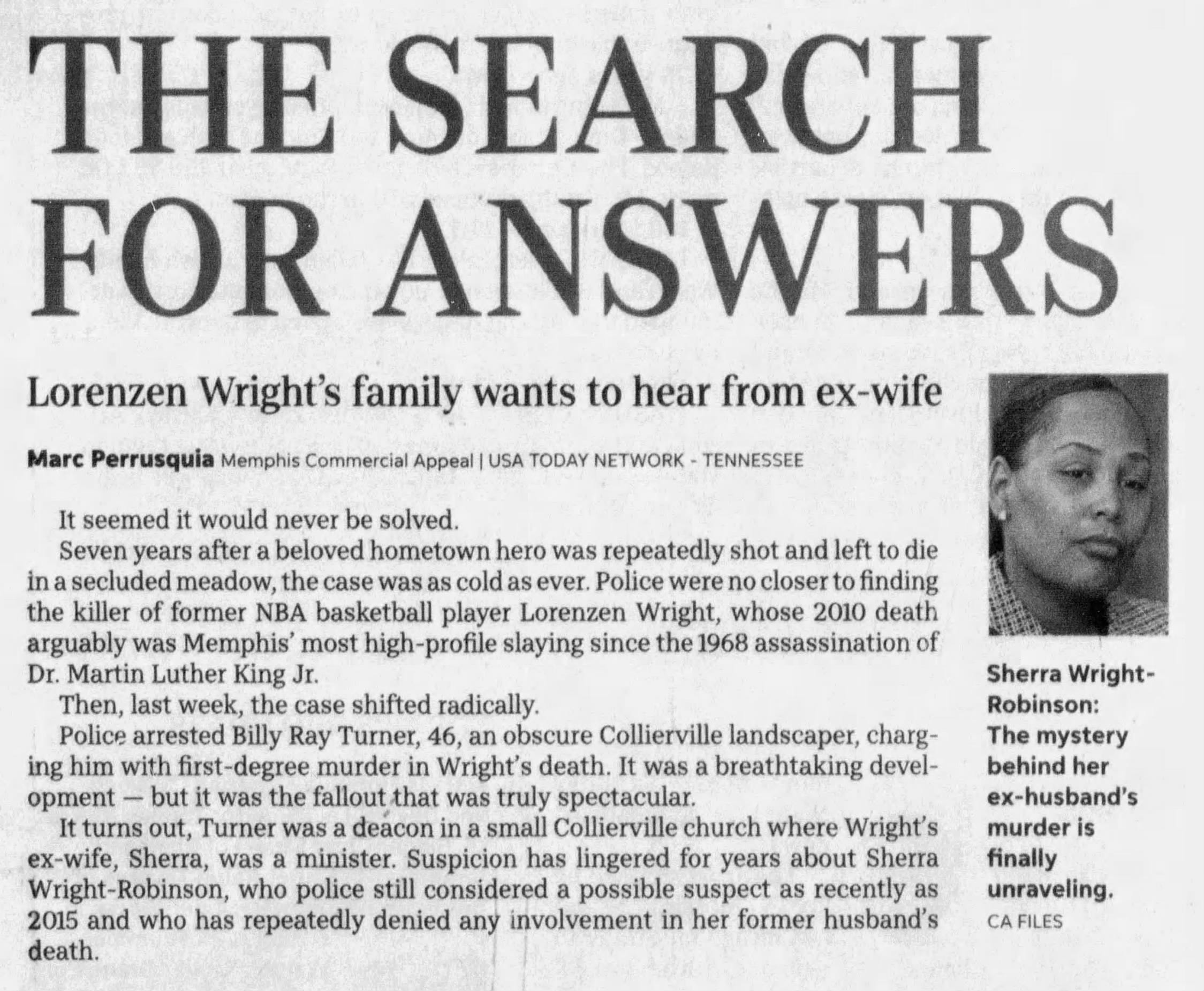 On December 15, 2017, investigators arrested another suspect who was much closer to the victim. That person was Sherra Wright-Robinson, Lorenzen Wright’s former wife. Authorities arrested Wright-Robinson in Riverside, California, and charged her with first-degree murder, conspiracy, and solicitation to commit murder, accusing her of helping plan the murder of her ex-husband.