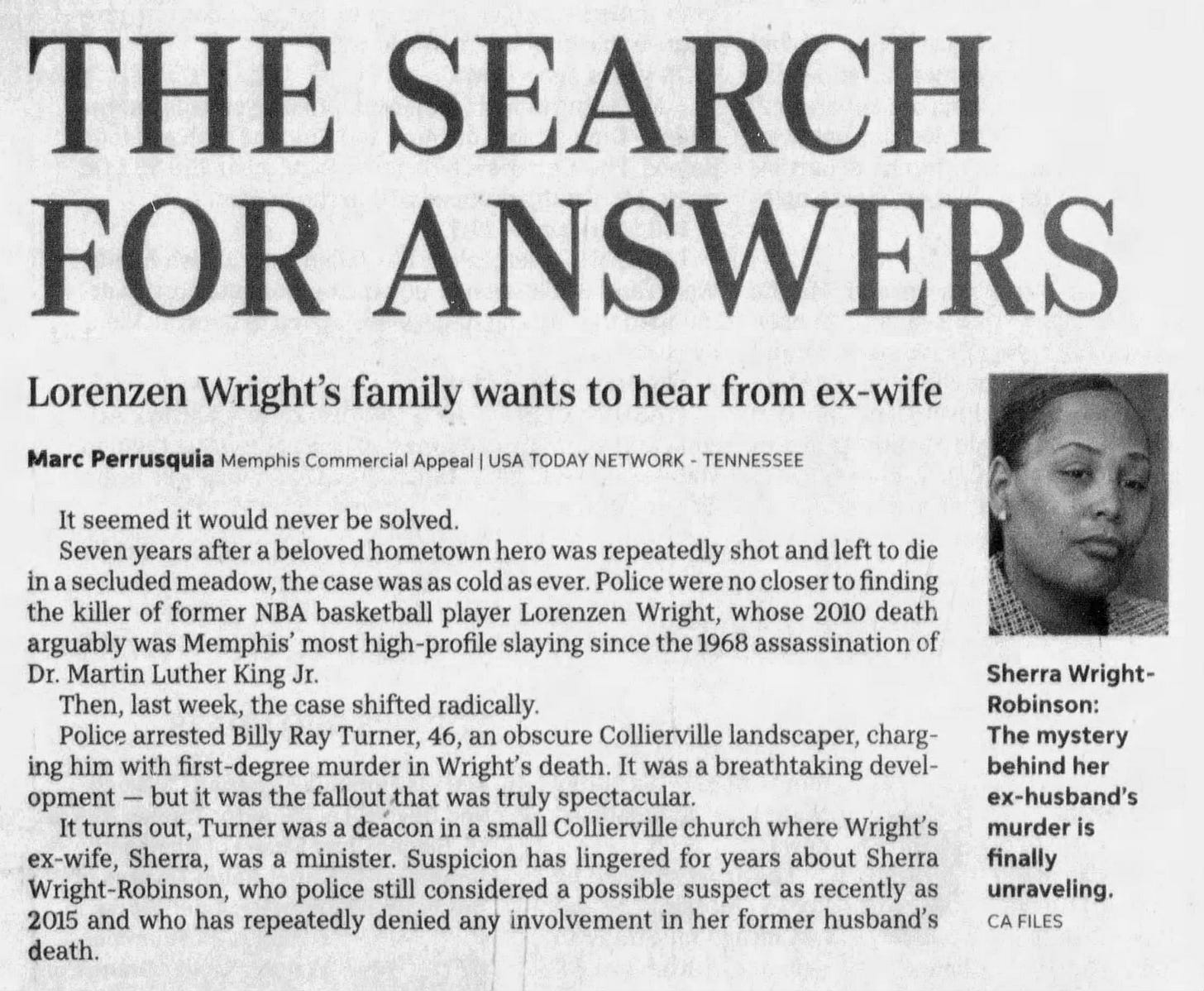 In July 2010, Lorenzen Wright was back in the Memphis area visiting family and spending time with his children. It had only been a few months since his divorce from Sherra earlier that year, and he was trying to adjust to a new chapter in life. On the evening of July 18, Wright visited his ex-wife at her home in Collierville, Tennessee, about 30 miles east of Memphis. According to Sherra Wright-Robinson, he stopped by to see their children and talk for a while before leaving later that night.