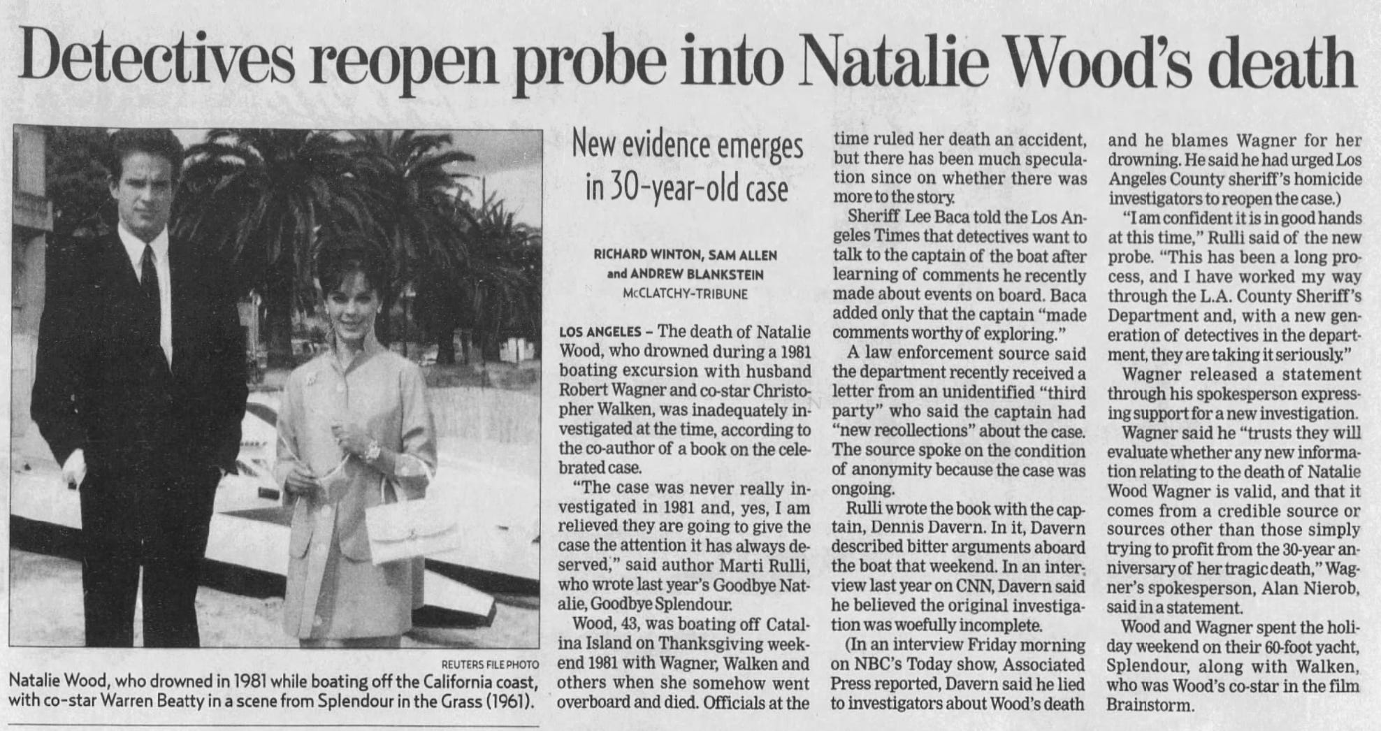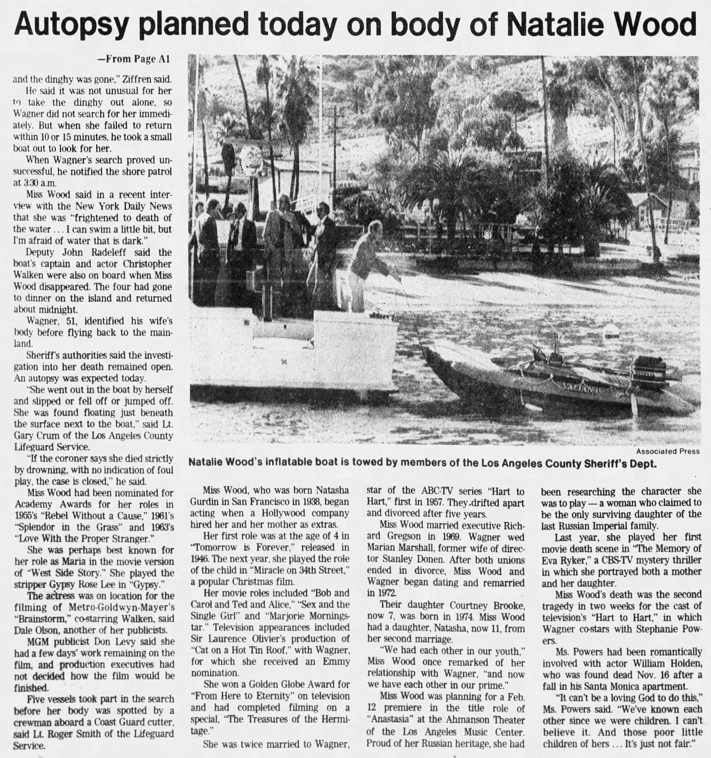 Dechant, Lawrence. “Natalie Wood Autopsy Report Revised; Actress Bruised Before Death.” ABC News, 14 Jan. 2013, https://abcnews.com/Entertainment/natalie-wood-autopsy-hints-assault/story?id=18212595